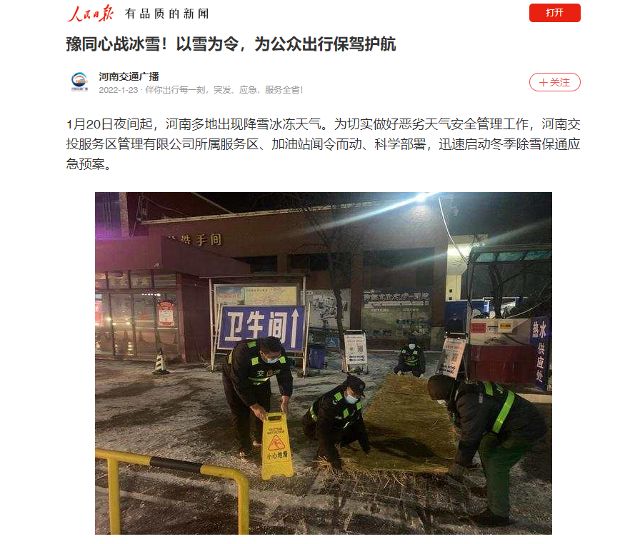來源: 本站 發(fā)布時間: 2022-01-232022年1月22日,人民日報以題為《豫同心戰(zhàn)冰雪!以雪為令,為公眾出行保駕護(hù)航》對公司所屬服務(wù)區(qū)全力應(yīng)對極端天氣,為司乘人員出行保駕護(hù)航進(jìn)行了報道。網(wǎng)址:https://wap.peopleapp.com/article/rmh26186441/rmh26186441截圖: